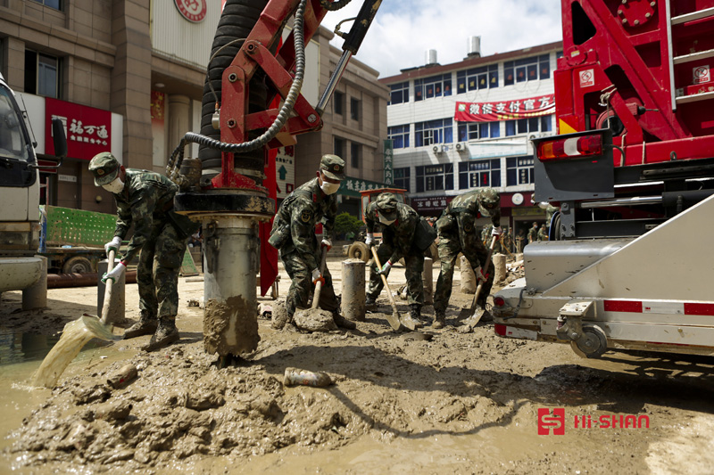 武警8710部隊(duì)官兵承擔(dān)了最為艱難的農(nóng)貿(mào)市場(chǎng)道路清淤、消殺防疫的攻堅(jiān)戰(zhàn)。為提高救援施工效率,武警部隊(duì)與海山機(jī)械迅速動(dòng)員,火速趕赴100多公里以外的災(zāi)區(qū)。