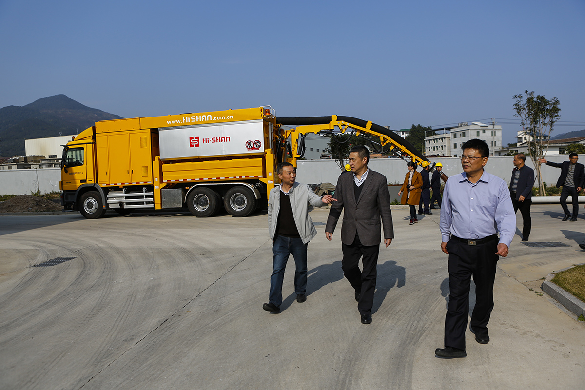 嚴(yán)效東一行在海山常務(wù)副總經(jīng)理張秋先陪同下,觀看了海山污染清除車、步履式施工裝備、非破壞性挖掘抽吸車、真空垃圾收集系統(tǒng)等產(chǎn)品演示。嚴(yán)效東在海山生產(chǎn)車間,詳細(xì)聽取了張秋先對(duì)海山幾大系列產(chǎn)品的制造與裝配過程的介紹。