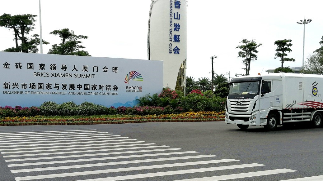 廈門市環(huán)衛(wèi)為了以最好的城市面貌迎接金磚峰會,從福建海山機(jī)械股份有限公司采購了代表當(dāng)今道路深度清潔世界先進(jìn)水平的重器–重型道路污染清除車,以滿足高標(biāo)準(zhǔn)會場以及核心區(qū)域的地面環(huán)境要求,使廈門以更加靚麗的姿態(tài)迎接來自世界各地的金磚貴賓。