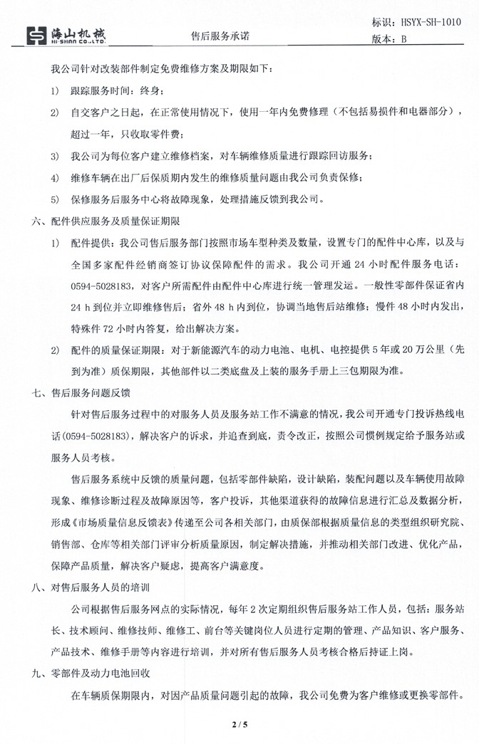 3、質保期內發(fā)生非人為的機械故障和零部件的損壞,福建海山機械負責免費更換。