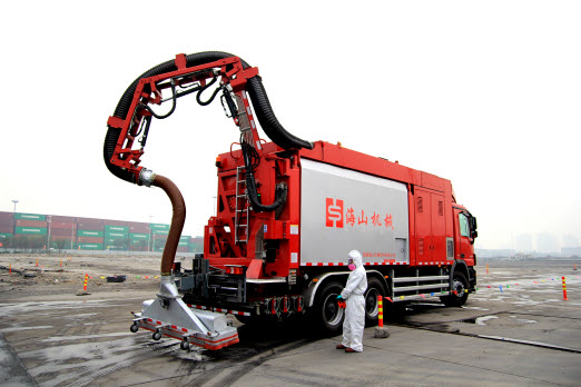 本次施工改變了傳統的由清掃車清掃作業(yè)、灑水車高壓沖洗、多種洗消設備聯合作業(yè)的施工模式,由一臺抽吸車即可完成,對污染物的清除率達到現場的環(huán)保施工要求。相對于傳統的作業(yè)方式,全密閉、無拋灑、地表清洗干凈,工作效率提升5倍以上。