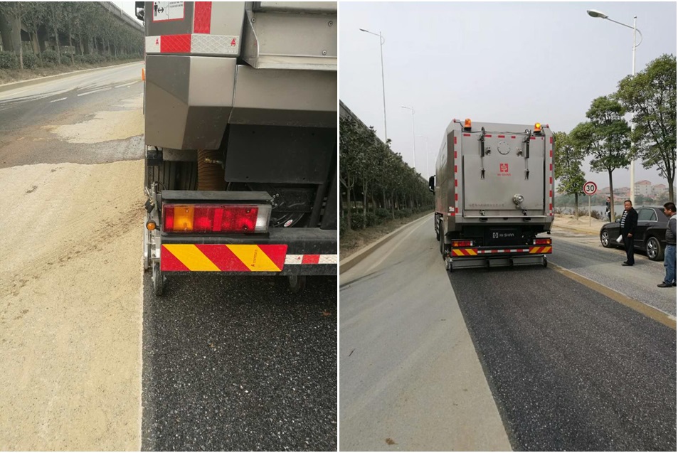 每當(dāng)演示時,強大的“海山颶風(fēng)牌”重型道路污染清除車行駛過的道路煥然一新,猶如新鋪設(shè)一般,石子顆粒清晰可見顯得格外凸顯,更有好奇者嘗試把手指往地上一抹,磨蹭手指竟然一塵不染,真正達(dá)到“席地而坐”的標(biāo)準(zhǔn),很多現(xiàn)場觀看該設(shè)備作業(yè)后的客戶及市民,都驚嘆頭一回看見這么厲害的“神器”。