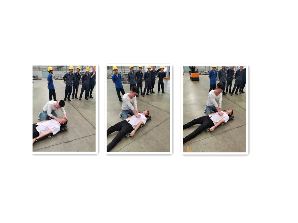 2、2021年7月26日上午10:00分左右,制造部車間員工XXX在作業(yè)過程中突然出現(xiàn)中暑現(xiàn)象,現(xiàn)場應急人員立即將中暑人員轉移到陰涼通風處,并讓病人平臥,解開衣扣,松開或脫去衣服,按摩軀干和四肢的皮膚肌肉,加速外圍血液循環(huán),促進散熱(或用冷水或用冰袋置于病人的頭、頸、腋下、腹股溝等處,或用酒精擦拭病人的頭、頸、腋下、腹股溝等處進行散熱)。針對重度中暑者,在采取上述措施的同時,立即撥打120,將患者迅速送往有條件的大醫(yī)院急診科治療。一旦發(fā)現(xiàn)病人呼吸、心跳停止應立即進行心肺復蘇。中暑急救演練、人工呼吸及胸外心臟按壓法演練圖片如下: