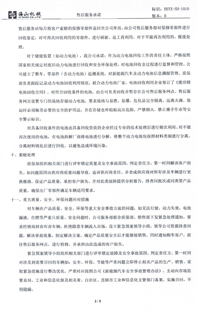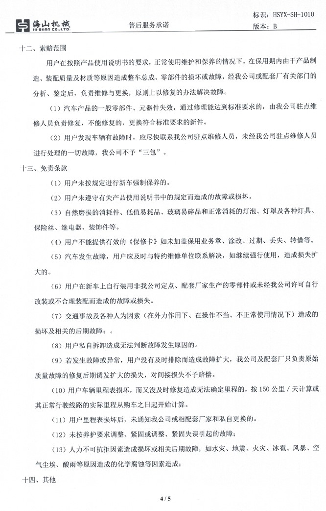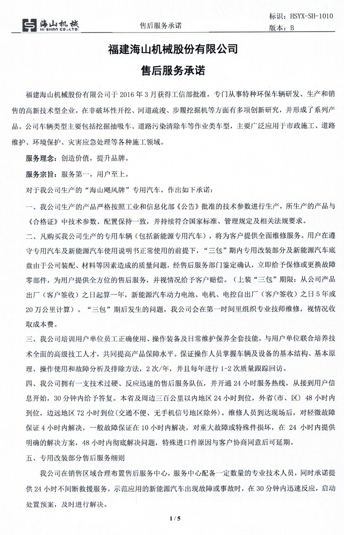 3、質保期內發(fā)生非人為的機械故障和零部件的損壞,福建海山機械負責免費更換。